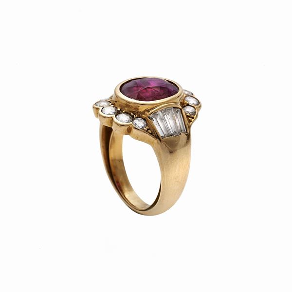MATERIAL: yellow gold, diamonds and ruby DESCRIPTION: ring made at the centre one ruby, framed by brilliant-cut diamonds, on each side of the ring baguette-cut diamonds MEASURE: 3.5 WEIGHT: ruby ct 4, diamonds ct 1.20, gr 11.2