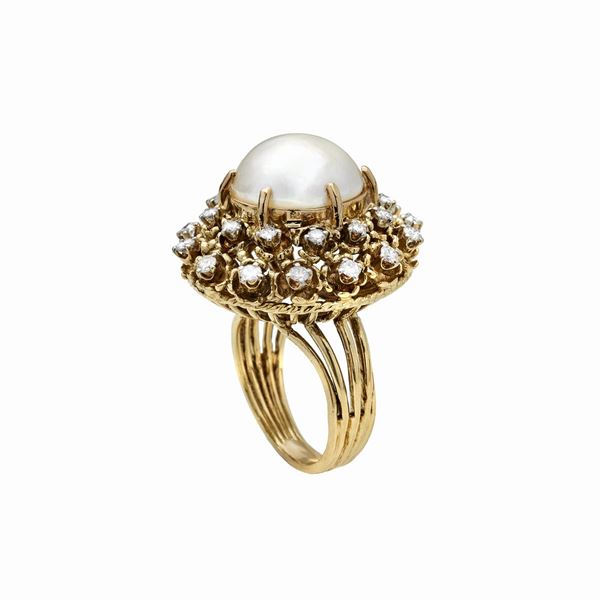 MATERIAL: yellow gold 18 kt, diamonds and mabè pearl DESCRIPTION: ring made with a huge central mabè pearl, framed by two lines of diamonds, put on signets made as flowers, bears the marck 18 kt MEASURE: 7 WEIGHT: diamonds ct 1.30, gr 19.9