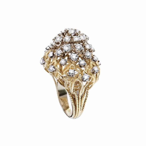 MATERIAL: yellow gold, white gold and diamonds DESCRIPTION: pyramid ring made with fishnet mesh in gold, centered and embellished with brilliant-cut diamonds SIZE: 6 WEIGHT: diamonds ct 3.20, 17,9 g