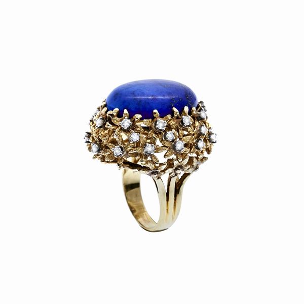 MATERIAL: yellow gold, lapislazuli and diamonds DESCRIPTION: big ring centered by oval cabochon-cut lapislazuli resting on high base made of small flowers illuminated by brilliant-cut diamonds SIZE: 14 WEIGHT: diamonds ct 0.70, 27.7 g