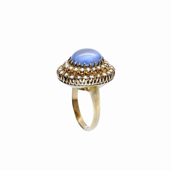 MATERIAL: yellow gold, clear sapphire and diamond DESCRIPTION: ring made of cabochon oval-cut clear sapphire embellished with two bands of brilliant-cut diamonds MEASURES: 8 WEIGHT: sapphire ct 3.0, diamond 1,30 ct, 10,3 g