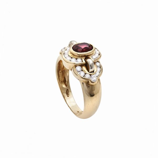 MATERIAL: yellow gold, ruby and diamond DESCRIPTION: ring with oval-cut ruby surrounded by brilliant-cut diamonds, arranged in a semicircle even sideways, bears the mark 750 SIZE: 8 WEIGHT: ruby 1.0 ct, diamonds 0.80 ct, 8.4 gr