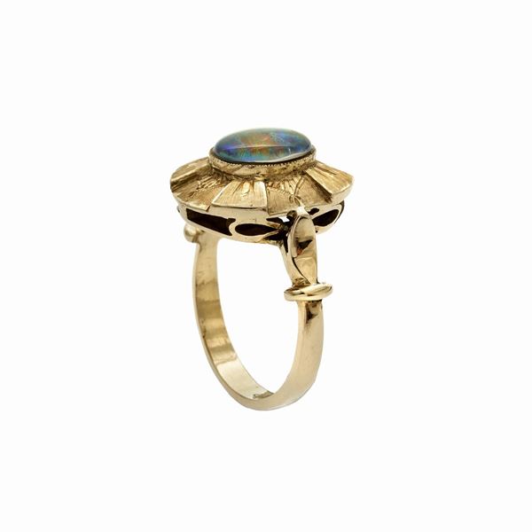 MATERIAL: yellow gold and opal DESCRIPTION: pair of oval clip-on earrings, each centered by cabochon-cut opal with gold band engraved with geometric motifs and ring en suite, bears the mark 750 MEASURES: earrings 1.8x1.5, ring 10 WEIGHT: gr total 22.3