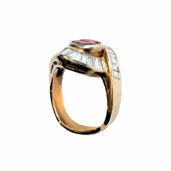 MATERIAL: yellow gold, diamonds, ruby DESCRIPTION: ring made with oval cut ruby center, embellished with diamonds baguette cut MEASURES: 6 ring WEIGHT: ruby ct. 2.0, diamonds ct 0.80, color G-H, purity VS, gr 7.3