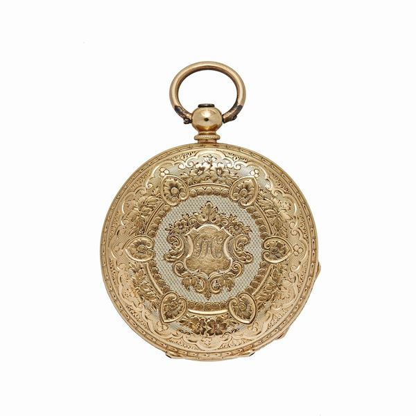 MATERIAL: yellow gold 18 Kt DESCRIPTION Pocket pocket watch with double casing in the back, with internal dedication, gold dial with black enamel roman numerals, douphine hands, 6-digit auxiliary dial, Manual charge, to be re-evaluated, the mark k18 MEASUREMENTS: diam mm 40 dial