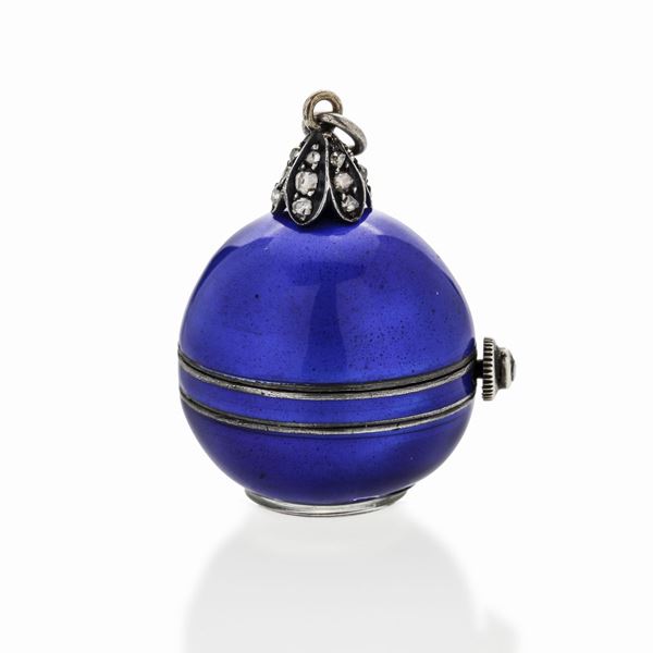 MATERIALE: metallo, diamanti e smalto blu DESCRIZIONE: pendente di forma sferica interamente rivestito in smalto blu con orologio, clip impreziosita con rose di diamante MISURE: diametro cm 2.4 h cm 3 PESO: gr 25.4