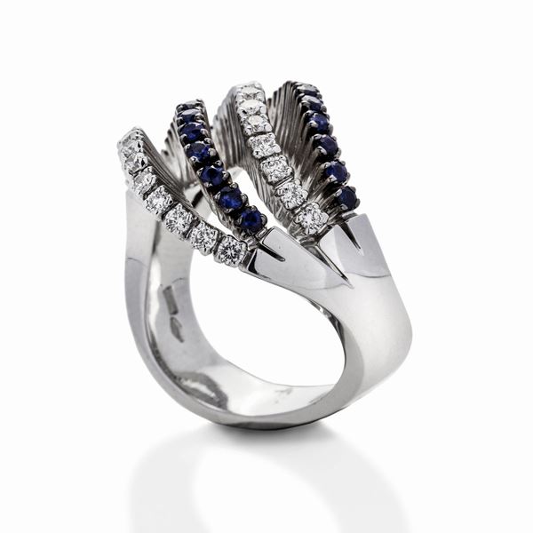MATERIAL: white gold, diamonds and sapphires DESCRIPTION: ring made with two bands embellished with brilliant cut diamonds and two with sapphires, signed Damiani, bears the mark 750 MEASURES: ring 6.5 WEIGHT: diamonds ct 0.50, color H, clarity IF, sapphires ct 0.67, gr 16.4
