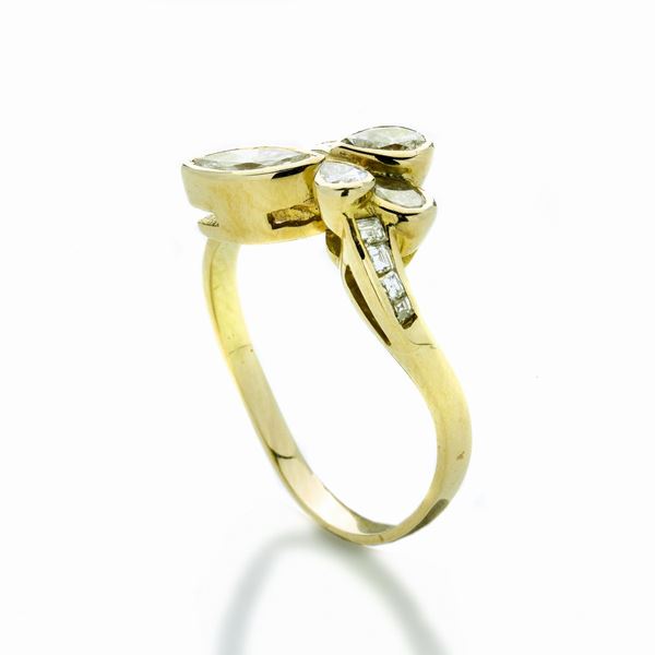 MATERIAL: yellow gold and diamonds DESCRIPTION: ring, of floral inspiration, made with drop-cut diamonds, navette and brilliant SIZES: ring size 7.5 WEIGHT : gr 3.5