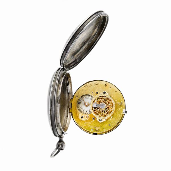 MATERIALS: silver, porcelain and enamels DESCRIPTION: double silver case engraved in the front, dial with ring decorated in polychrome enamels with landscape with fishermen, in the middle disk white background with Arabic numerals, hands with star, opening for the key between hours 1 and 3, accompanied by three coeval keys, very slight enamel defects, to be reviewed MEASURES: diameter mm 47