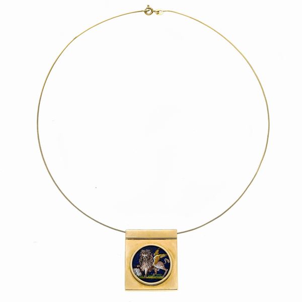 MATERIAL: yellow gold and micromosaic DESCRIPTION: semi-rigid necklace made with a rectangular yellow gold plate in the center embellished with micromosaic depicting the Lion of San Marco, the necklace bears the mark 750 MEASURES: necklace inner diameter 14 cm, micromosaic diameter 2 cm WEIGHT: gr 13.8 overall