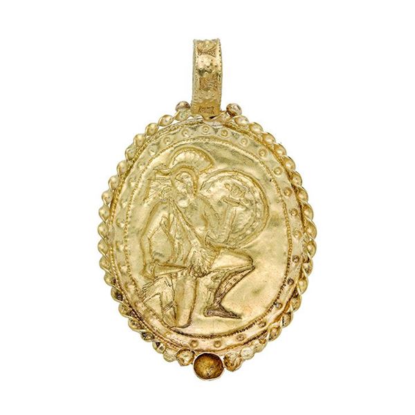 MATERIAL: yellow gold DESCRIPTION: large oval pendant made with a warrior figure in a classic pose, cantilevered, bears the 750 mark MEASURES: 4.6x 7.5h cm WEIGHT: 18.9 g