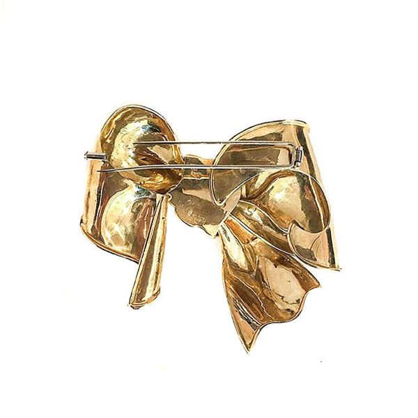 MATERIAL: yellow gold DESCRIPTION: large clip made like a bow shaped in the round, bears the 750 mark MEASURES: 8.6x7.5 cm WEIGHT: 47.5 g
