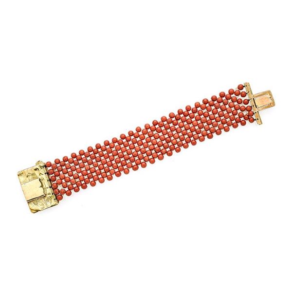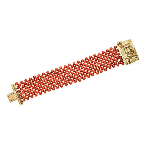 MATERIAL: yellow gold and red coral DESCRIPTION: bracelet made in imitation of the fabric in red coral spheres, great firmness in yellow gold depicting one of the labors of Hercules, bears the mark 750 MEASURES: open bracelet 18.5 WEIGHT: spheres 2 mm, 52.8 g