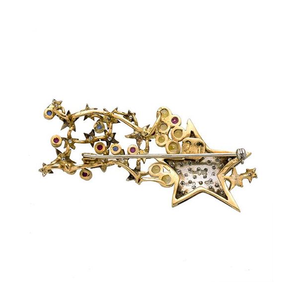 MATERIAL: yellow gold, white gold, rubies, sapphires, citrine quartz and diamonds DESCRIPTION: brooch made like a comet star entirely embellished with brilliant cut diamonds, rubies, sapphires and citrine quartz, signed Passerini, bears the Oropa 750 marks MEASURES: 6.5x 3h cm WEIGHT: 15.5 g