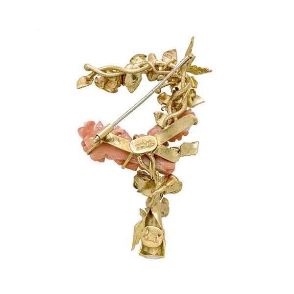 MATERIAL: yellow gold and pink coral DESCRIPTION: floral-inspired brooch made like a letter F entirely embellished with a rose and doves branch modeled in the round and pink coral flowers, signed Passerini, bearing the Oropa and 750 marks MEASURES: 4.6x 6.5h cm WEIGHT: 21.0 g