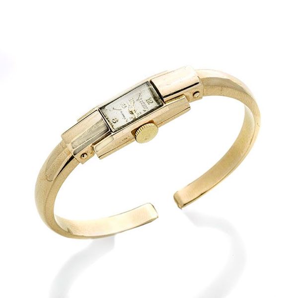 MATERIAL: yellow gold DESCRIPTION: lady's watch with rectangular case, smooth slightly rounded bezel, champagne colored dial, applied indexes and numbers, stick hands, manual winding movement, rigid bracelet that can be opened, bears the mark 750 MEASURES: internal diameter 5.3 cm , dial 7 mm.WEIGHT: 16.4 g
