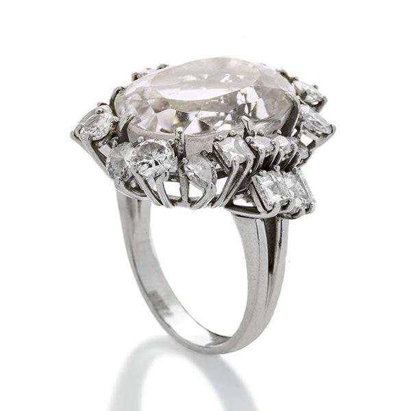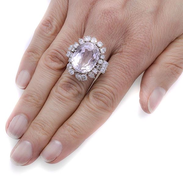 MATERIAL: white gold, diamonds and pink stone DESCRIPTION: large daisy ring made with oval cut pink stone framed by brilliant cut, drop and square cut diamonds, bears a hard to read punch MEASURES: ring 8 WEIGHT: 3.50 ct diamonds, color HI , VS purity, gr 18.2