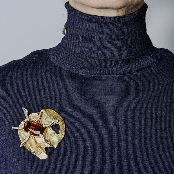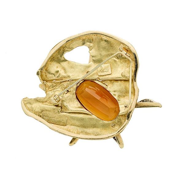 MATERIAL: yellow gold, yellow quartz and diamonds DESCRIPTION: large brooch made like a stylized Sun embellished with large oval yellow quartz and brilliant cut diamonds on a gold base, the latter bears engraved "La splendiente luce quando apare in ogni scura parte da chiarore, Davanzati", signed Passerini, bears the Oropa and 750 brands MEASURES: 7.4x 6.9h cm WEIGHT: 50.4 g