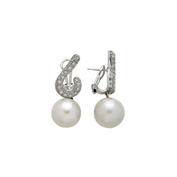 MATERIAL: white gold, diamonds and pearls DESCRIPTION: pair of pendant earrings with clips each made with a stylized leaf embellished with pavé of diamonds and pearl as a pendant MEASURES: earrings cm 1.0x 3.8h WEIGHT: pearls diameter mm 3, g 18.0