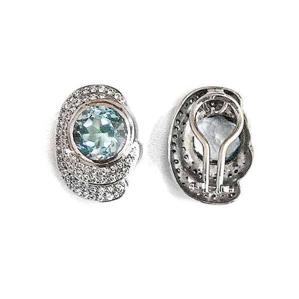 MATERIAL: 14 kt white gold, diamonds and topaz DESCRIPTION: pair of earrings each made with topaz between two concentric bands slightly rounded entirely embellished with pavé diamonds, bear the 14 kt mark MEASURES: 2.8.x 4.2h cm WEIGHT: 18.7 g