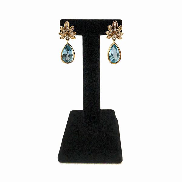 MATERIAL: yellow gold, diamonds and blue quartz DESCRIPTION: set consisting of a pair of floral-inspired earrings each made with flower clips embellished with brilliant cut diamonds and pendant part with drop cut aquamarine and large en suite pendant MEASURES: earrings 1.2x 3.8h cm; pendant 2.8x 5.2h cm WEIGHT: 33.4 g