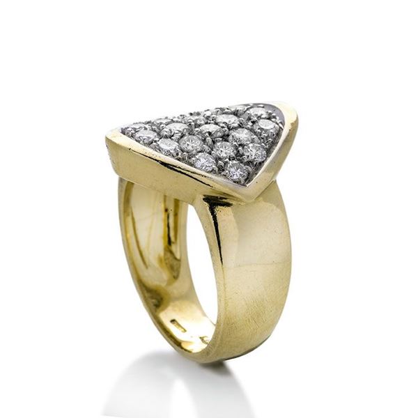 MATERIAL: yellow gold and diamonds DESCRIPTION: geometric-inspired shield ring, embellished with diamond pavé, bears the 750 mark MEASURES: ring 4.75 WEIGHT: 7.2 g