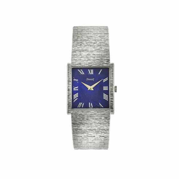 MATERIAL: white gold and lapis lazuli DESCRIPTION: lady's watch with rectangular case, lapis lazuli dial with printed Roman numerals, douphine hands, manual winding movement, original bracelet in white gold in imitation of the fabric, case n ° 9286 A6, signed Piaget, engraved with the initials LG on the buckle and the 750 mark, accompanied by a repair guarantee certificate MEASURES: diameter 24 mm, open bracelet 16.6 cm WEIGHT: 72.9 g
