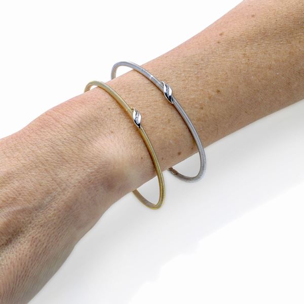 MATERIAL: yellow gold, white gold and diamonds DESCRIPTION: pair of rigid bracelets, each made in a torchon and embellished with small diamonds in the central part, bear the 750 mark MEASURES: internal diameter 6.4 cm WEIGHT: 24.8 g