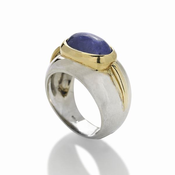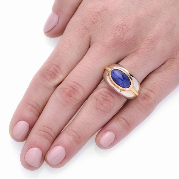 MATERIAL: white gold, yellow gold and sapphire DESCRIPTION: ring made as a convex band with oval cabochon-cut sapphire with relief frame in yellow gold, bears the 750 mark MEASURES: ring 7 WEIGHT: 15.4 gr