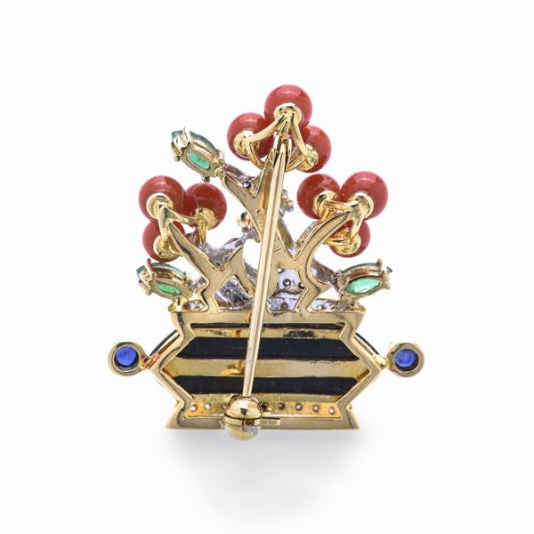 Basket brooch in yellow gold, onyx, diamonds, sapphires, emeralds and red coral