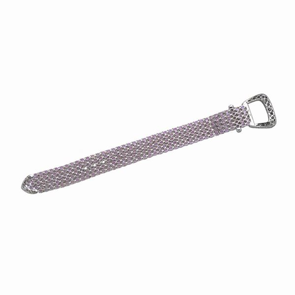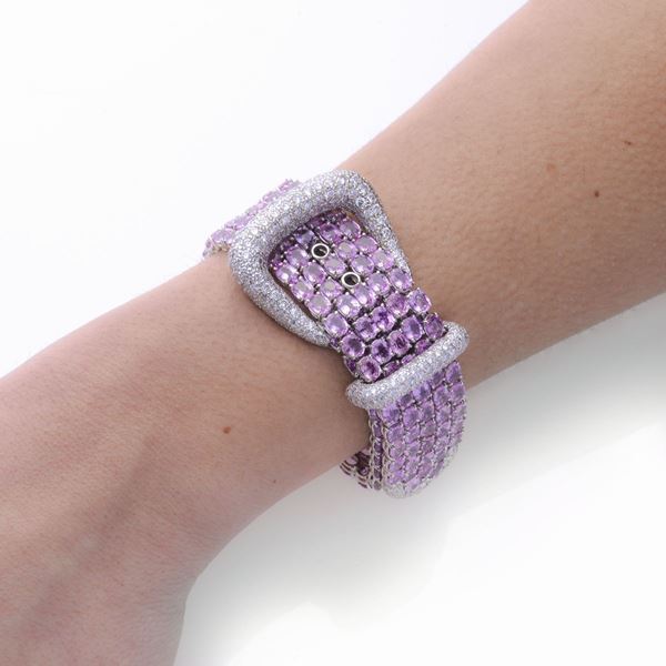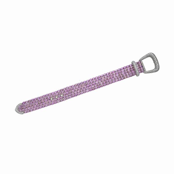 MATERIALE: white gold, diamonds and pink sapphires DESCRIPTION: belt bracelet made like a belt in oval-cut pink sapphires, with buckle entirely embellished with brilliants pavè, bears the 750 and 18kt marks MEASURES: open cm 23.5 WEIGHT: sapphires ct 88, diamonds ct 3.0, 82.5 g