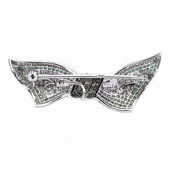 MATERIAL: white gold, emeralds and diamonds DESCRIPTION: broock made like a bow, centred by an old-cut diamond, entirely embellished with old-cut and huit-huit diamonds, with carré-cut emerald profiles, bears the 750 mark MEASURES: length 5 cm WEIGHT: 9.0 gr