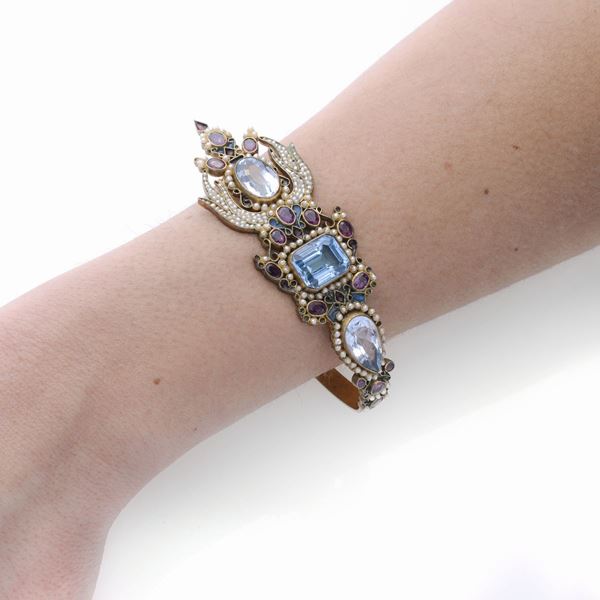 MATERIAL: low-titer gold, yellow gold, rubies, micro-pearls and blue topaz DESCRIPTION: semi-rigid bracelet, of Renaissance inspiration, made as a branch of lanceolate leaves, entirely embellished with citrine quartzes of various cuts, micro-pearls and rubies, partly rigid bracelet and partly with intertwined link chain, signed Percossi Papi, the chain bears the 750 mark MEASURES: internal diameter 7 cm WEIGHT: 18.9 g