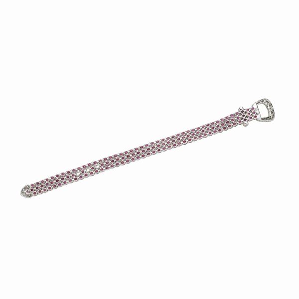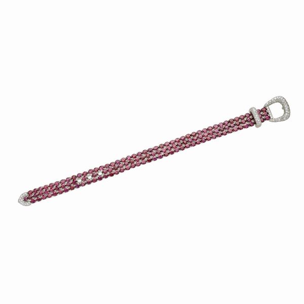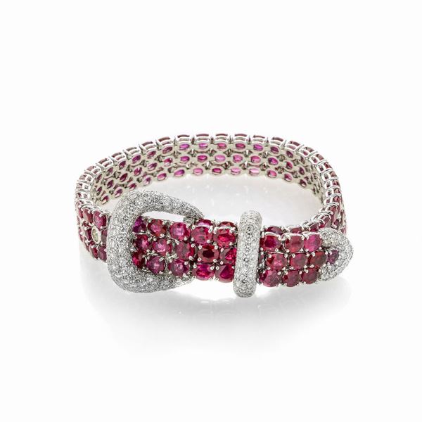 MATERIAL: white gold, diamonds and rubies DESCRIPTION: bracelet made like a bel in oval-cut ruby, with buckle entirely embellished with brilliant pavè, bears the 750 and 18kt marks MEASURES: open 23 cm WEIGHT: rubies ct 40, diamonds ct 1.50, 50.6 g