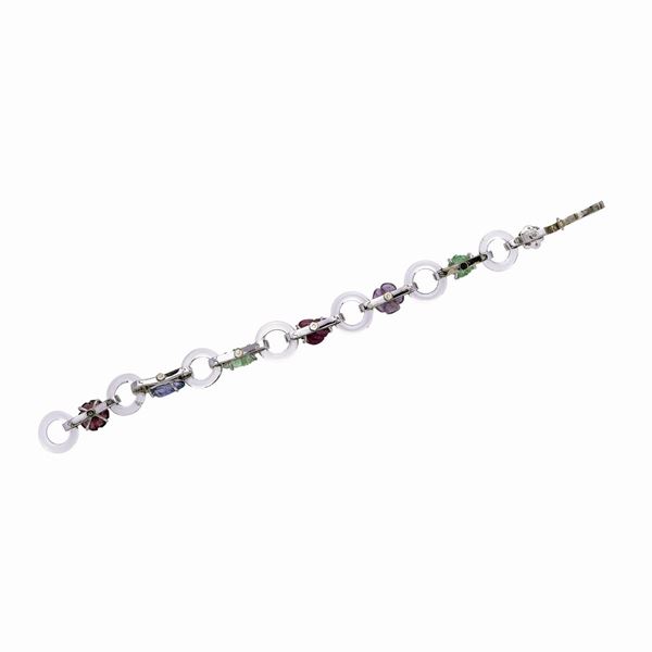 MATERIAL: white gold, diamonds, rock crystal, sapphires, rubies, emeralds and amethyst DESCRIPTION: "tutti frutti" bracelet made with rectangular links, each embellished with a flower in various engraved stones and diamonds, alternating with circle links in crystal of cone, bears the 750 mark MEASURES: open 17.5 cm WEIGHT: 17.9 g