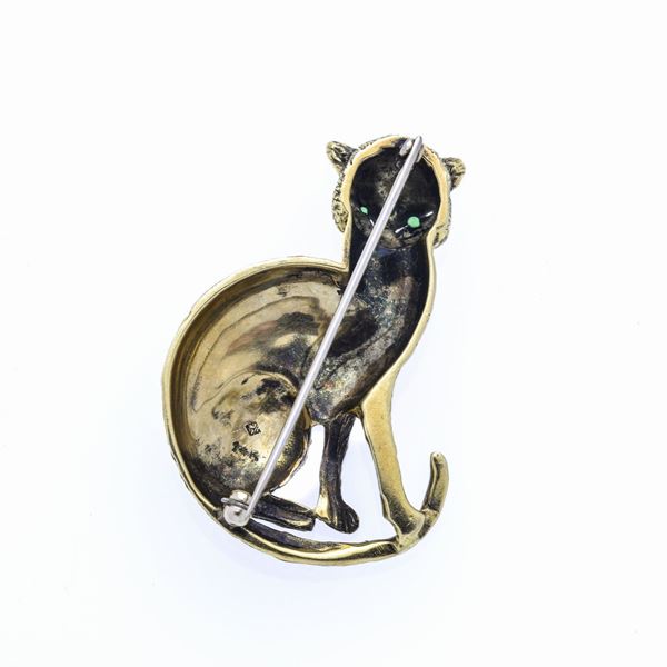 MATERIAL: 14 kt yellow gold and emeralds DESCRIPTION: brooch made like a cat with emerald eyes and gold body engraved in imitation of the hair, bears the 14 kt mark MEASURES: 2.8x 4h cm WEIGHT: 12.0 gr