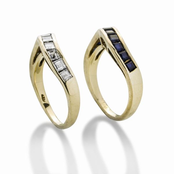 MATERIAL: yellow gold, diamonds and sapphires DESCRIPTION: ring made with two shaped bands, each embellished with carré-cut diamonds and carré-cut sapphires, both bearing the 750 mark MEASURES: 6 ring WEIGHT: 9.1 gr