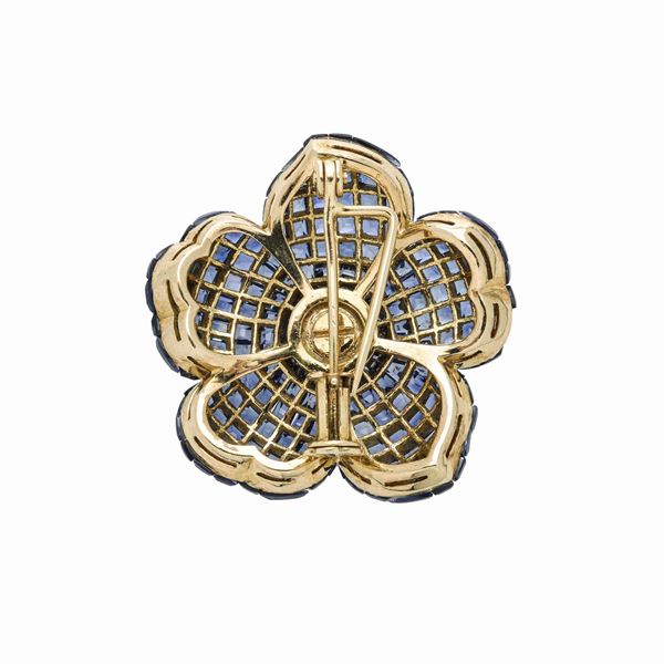 MATERIAL: yellow gold, sapphires and diamonds DESCRIPTION: clip made like a flower, slightly rounded, with seven brilliant-cut diamonds in the center and large petals with sapphires mounted with invisible setting, bears the 750 mark MEASURES: diameter 2.5 cm WEIGHT: sapphires ct 3.50, diamanti ct 1.50, 12.2 g