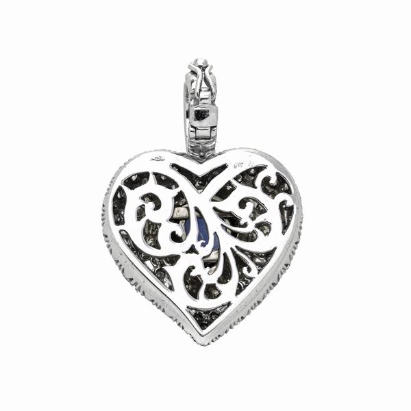 MATERIAL: white gold, yellow gold, diamonds and sapphire DESCRIPTION: heart pendant made with heart-cut sapphire in the center framed with diamond pavè, bears the 750 mark MEASURES: cm 2.3x 3.5h WEIGHT: sapphire ct 2.50, diamonds ct 4.0, color G / H, VS, 13.5 g