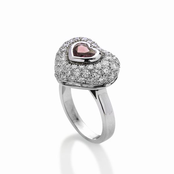 MATERIALE: white gold, diamonds and ruby DESCRIPTION: heart ring made with ruby framed with diamond pavè arranged on a slighty rounded base, bears the 750 mark MEASURES: ring 7.5 WEIGHT: 11.5 g