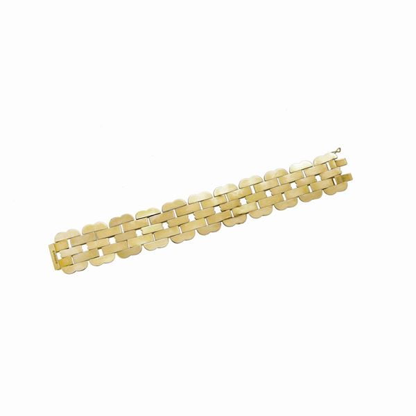 MATERIAL: yellow gold DESCRIPTION: high bracelet made with concave and convex links joined together by semicircle links, bears the 750 mark MEASURES: open 19 cm WEIGHT: 54 gr