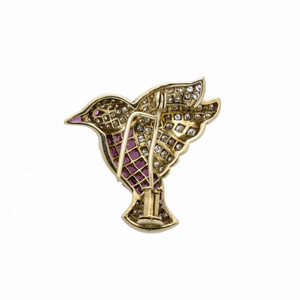 MATERIAL: yellow gold, diamonds and rubies DESCRIPTION: clip realistically modeled like an hummingbird, eyes and beak in rubies, head and wings embellished with brilliant-cut diamonds, body with rubies with invisible setting, bears the 750 mark MEASURES: 2.7x 2.6h WEIGHT: diamonds ct 0.90, rubies ct 1.0, 7.9 g