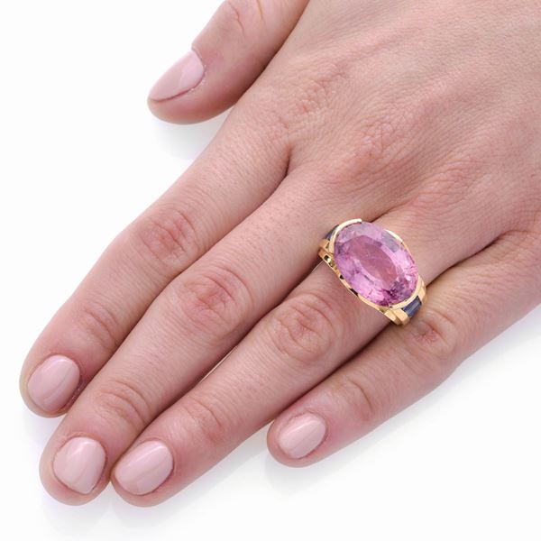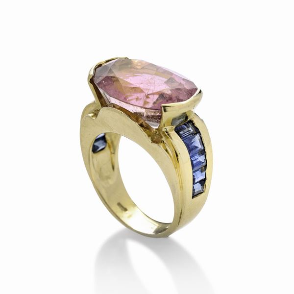 MATERIAL: yellow gold, sapphires and pink tourmaline DESCRIPTION: large ring made with oval-cut pink tourmaline on a high shaped base embellished on each side with carrè-cut sapphires, bears the 750 mark MEASURES: ring 7.5 WEIGHT: 13.4 g