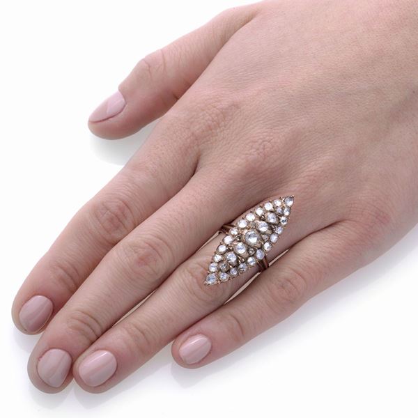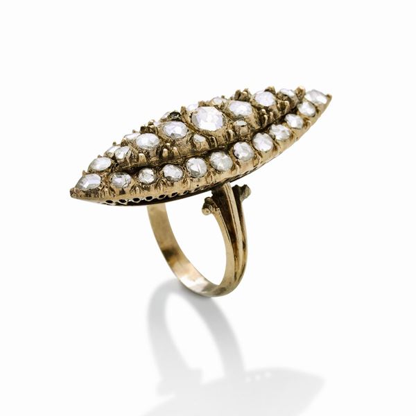 MATERIAL: low title gold and diamonds DESCRIPTION: lozenge ring entirely embellished with rose cut diamonds arranged on two bands, a missing diamond MEASUREMENTS: ring 5.5 WEIGHT: gr 8.8