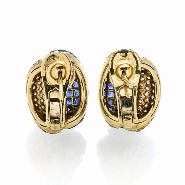 MATERIAL: yellow gold, diamonds and sapphires DESCRIPTION: pair of clip earrings each made as a knot embellished with pavè of diamonds and sapphires with invisible setting, bear the 750 mark MEASURES: cm 1.5x 1.9h WEIGHT: gr 16.3