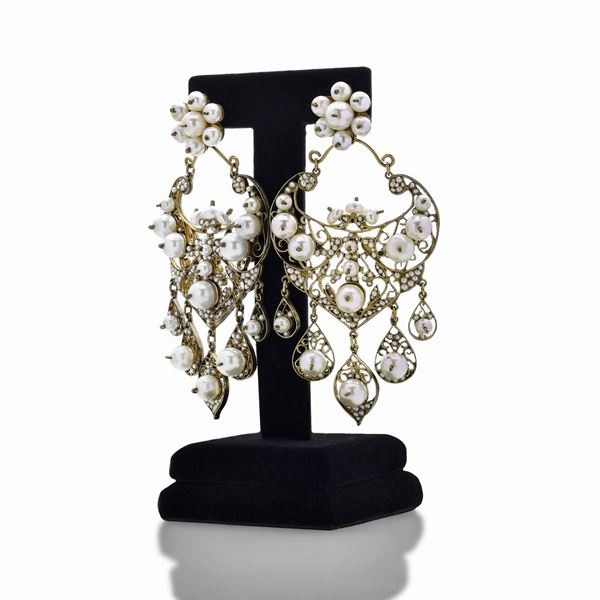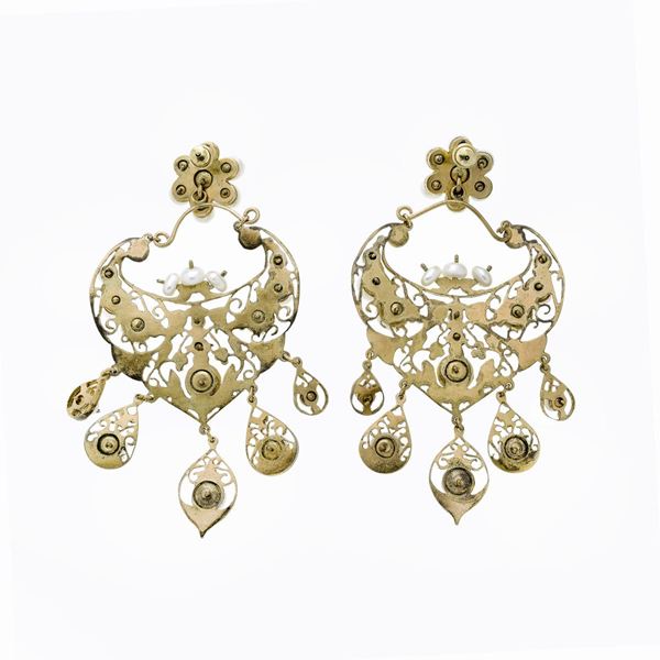 Pair of large drop earrings in low titre gold, micro-pearls and pearls