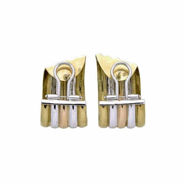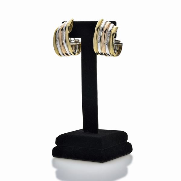 MATERIAL: yellow gold, white gold, pink gold and diamonds DESCRIPTION: pair of pendant earrings, each made with large pods in the three colors of gold, two of which are embellished with diamonds, bear the 750 mark MEASURES: cm 2.0 x 3.0h WEIGHT: 21.4 g