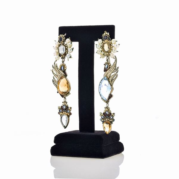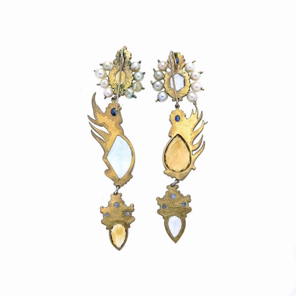MATERIAL: low titre gold, micro-pearls, pearls, sapphires, citrine quartz and blue topaz DESCRIPTION: pair of long similar pendant earrings, of Renaissance inspiration, each made with clip with cartouche embellished with quartz and pearls, central part stylized with topaz and blue quartz fantasy cut and micro-pearls and pendant with citrine and blue quartz and stones of various cuts MEASUREMENTS: length 9.3 cm WEIGHT: 20.9 g