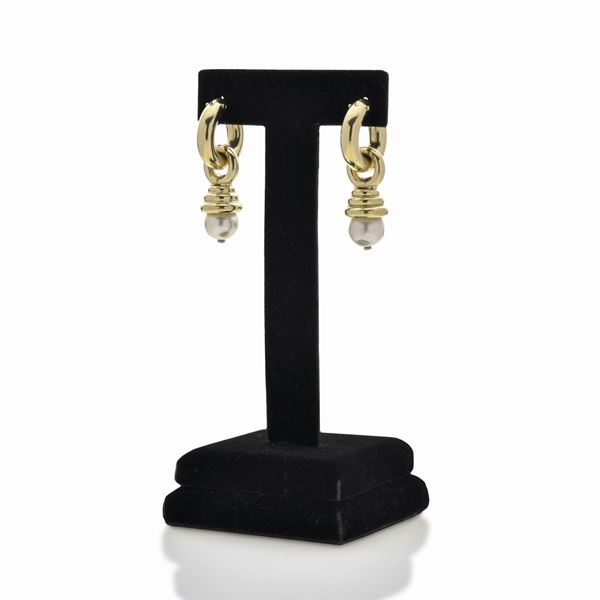 MATERIAL: yellow gold and cultured pearl DESCRIPTION: pair of earrings, each made with a rounded circle with a spiral pendant that frames a pearl, the pendant is removable, bearing the 750 mark MEASURES: cm 1.3x 3.7h WEIGHT: 12.4 gr