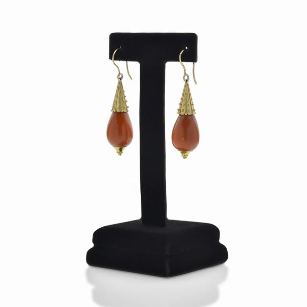 MATERIAL: yellow gold and pink coral DESCRIPTION: pair of pendant earrings, each made with hook clip, part in yellow gold worked with small studs that supports a drop-cut red coral MEASUREMENTS: cm 1.4x 4.0h WEIGHT: 14.6 g